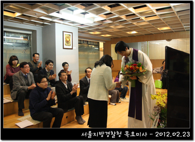 서울지방경찰청 목요미사 이대수(사도요한)부위원장 신부님 환영 축하꽃다발 전달식 일시 : 2012. 2. 23 (목) 장소 : 미카엘성당